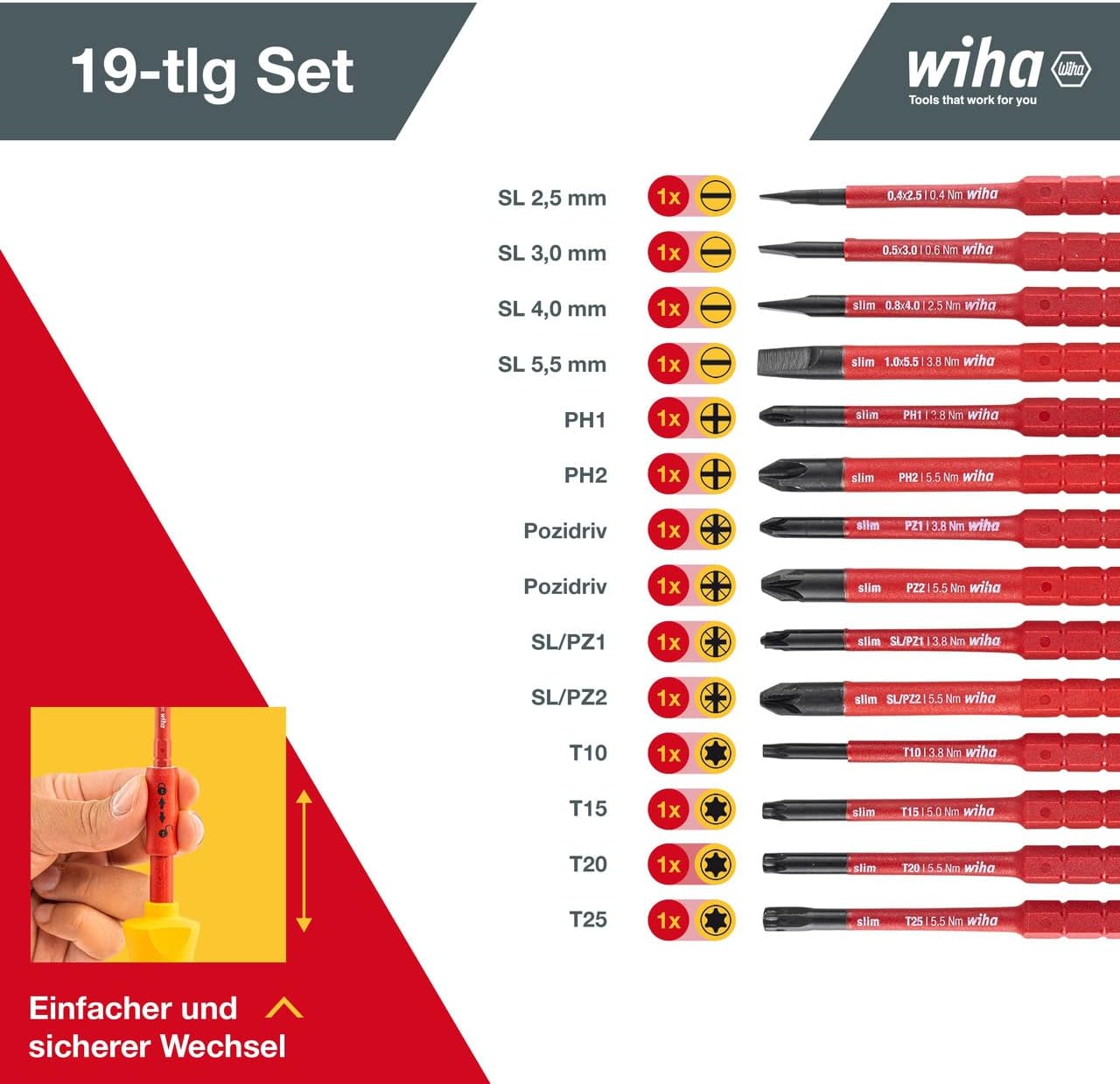 Wiha 36068 16 Piece SlimVario VDE Screwdriver Wallet Set The Wiha 16 piece SlimVario screwdriver wallet set is an innovative interchangeable screwdriver set that solves a commonly occurring problem for electricians. With many VDE screwdrivers, the insulation often obstructs and prevents access to low-lying fastening elements. The SlimVario system combats this by reducing the diameter of the blade by 33%, allowing access to low-lying fasteners and spring clips. This is achieved by spraying a protective insulation directly onto the end of the blades and completely integrating the insulation onto the lower blade area. Each blade is made from chrome-vanadium-molybdenum steel with a hardened black finish. The Wiha’s SoftFinish multi-component handle provides a secure, comfortable grip and has roll-off protection to prevent the handle from rolling away when put down. The handle measures 160mm, with an integrated quick-release bit holder to accept the blades and a free-spin sleeve for rapid operation. Ideal for low-lying fastening elements. VDE approved, safe up to 1000V (AC). Includes: bit holder, slotted voltage tester & 14x interchangeable blades.