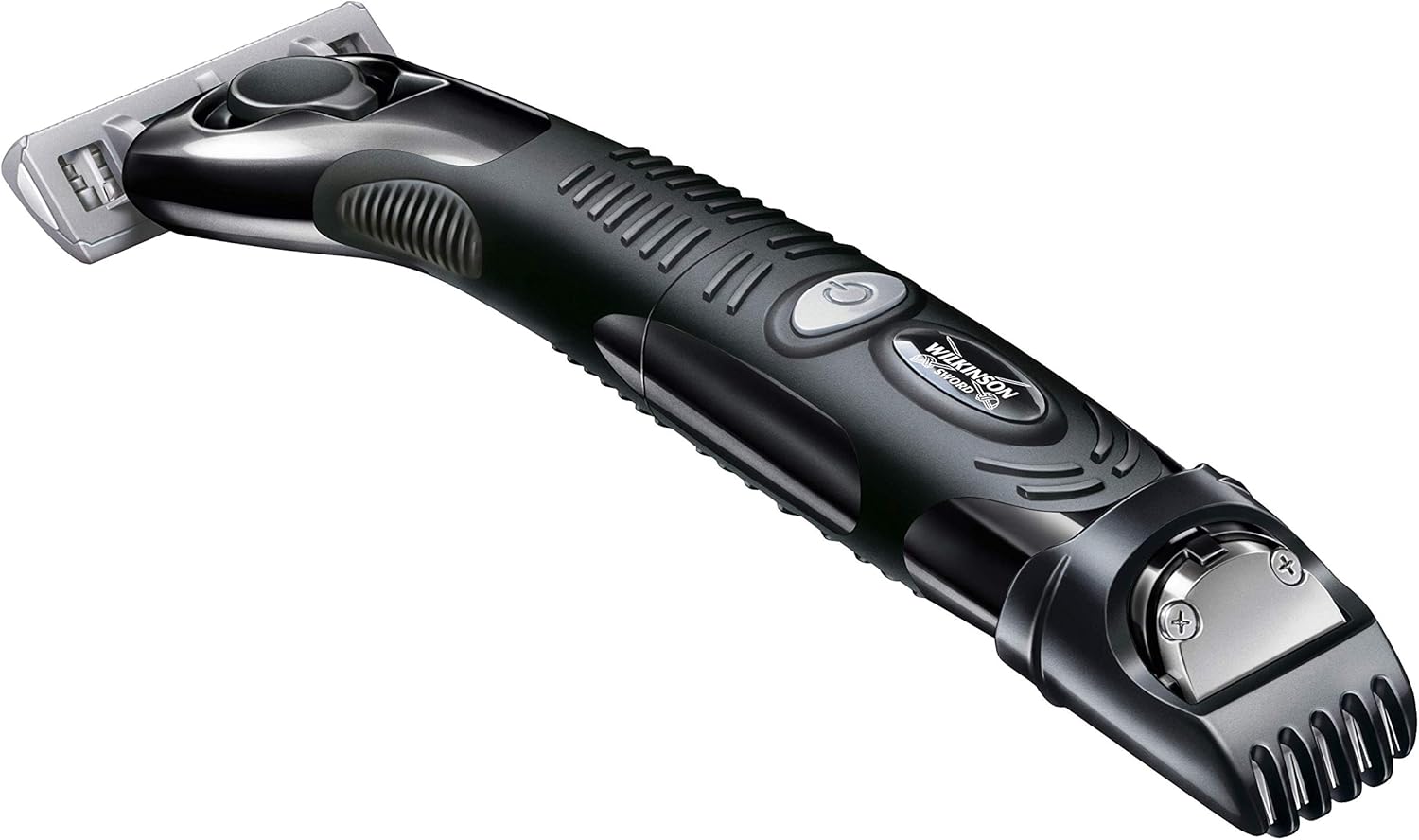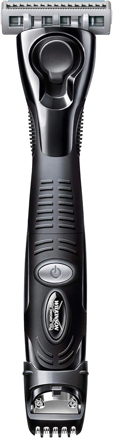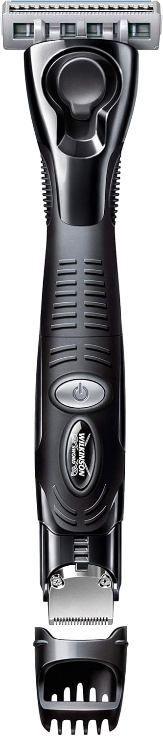 The Wilkinson Sword Quattro Titanium Precision Razor is a grooming tool that shaves, edges, and trims. Four titanium coated blades give a smooth finish. The battery-powered trimmer has four adjustable levels, and can be used in the shower. An edging blade on the back of the razor helps to create precise lines around beards, sideburns, and under the nose. A lubricating strip contains Vitamins E and ProB-5 and gives a smooth glide. This pack includes one Quattro Titanium Precision Razor and one AAA battery.