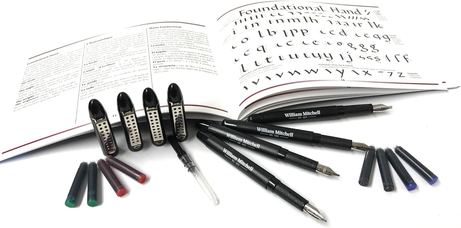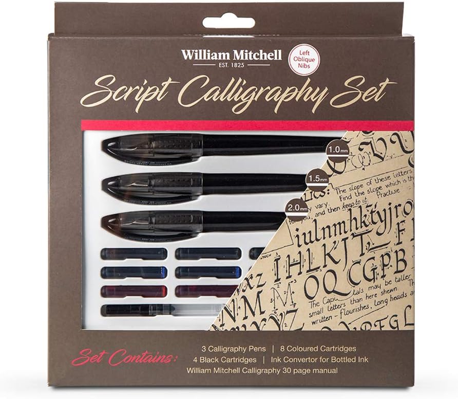 This William Mitchell Calligraphy Gift Set includes 4 fountain pens with lids. The nibs come in 4 different sizes for a wide range of writing effects. The art of calligraphy is about expression of words. Develop your skills and let your ideas flow freely on to the page with this ink cartridge. With the extra ink cartridges you wont have to worry about running out of ink and it ensures that your pen will never be out of action. In addition the set also includes a 30 page step-by-step guide to calligraphy manual. William Mitchell nib points have a protective