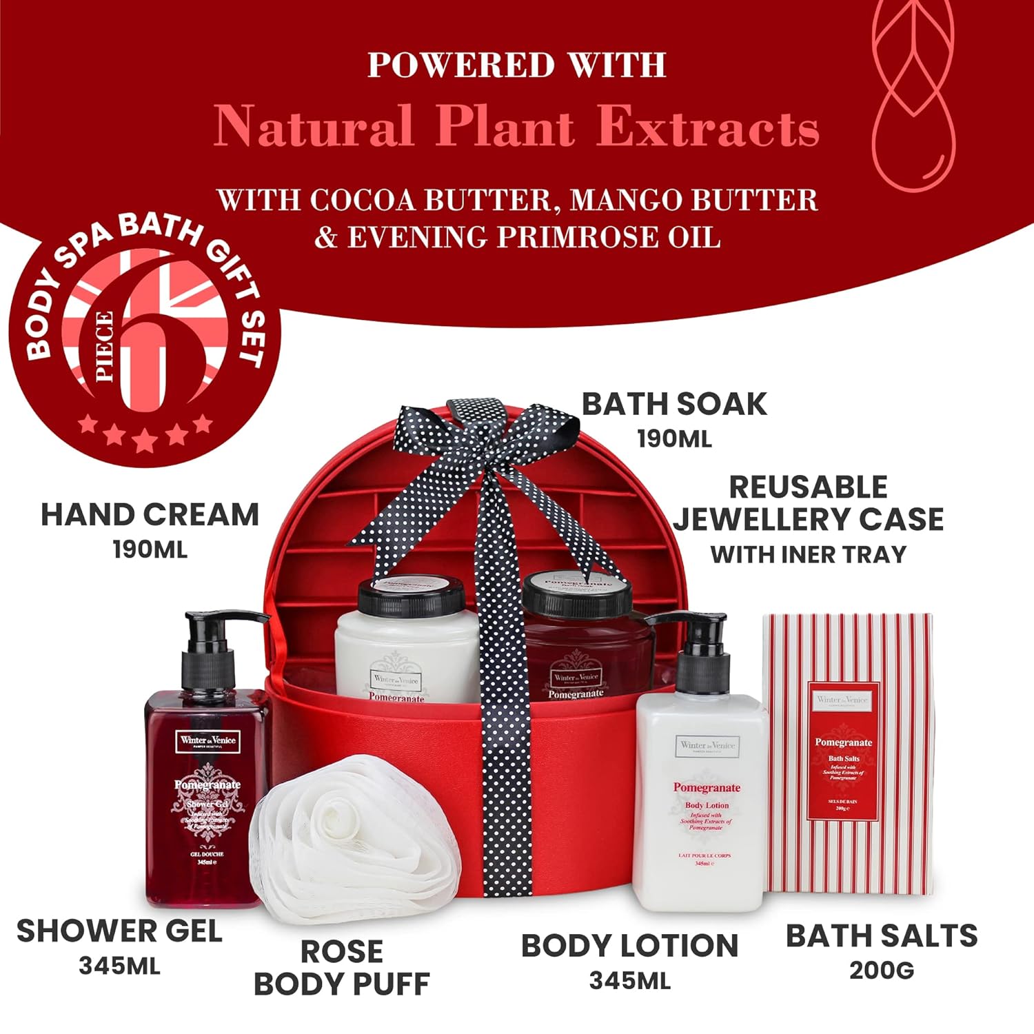 This gift set is one of our Best Sellers! It is a real jewellery box turned into a bath gift set. Notice that once you take the toiletries out you can actually see the inner tray which has grids designed to hold earrings and rings, whilst the box itself can hold bangles and chunky necklaces. It really is a jewellery box and two gifts in one. The set includes a collection of luxurious toiletries and a rose puff all neatly presented in this bright red and black jewellery case.
