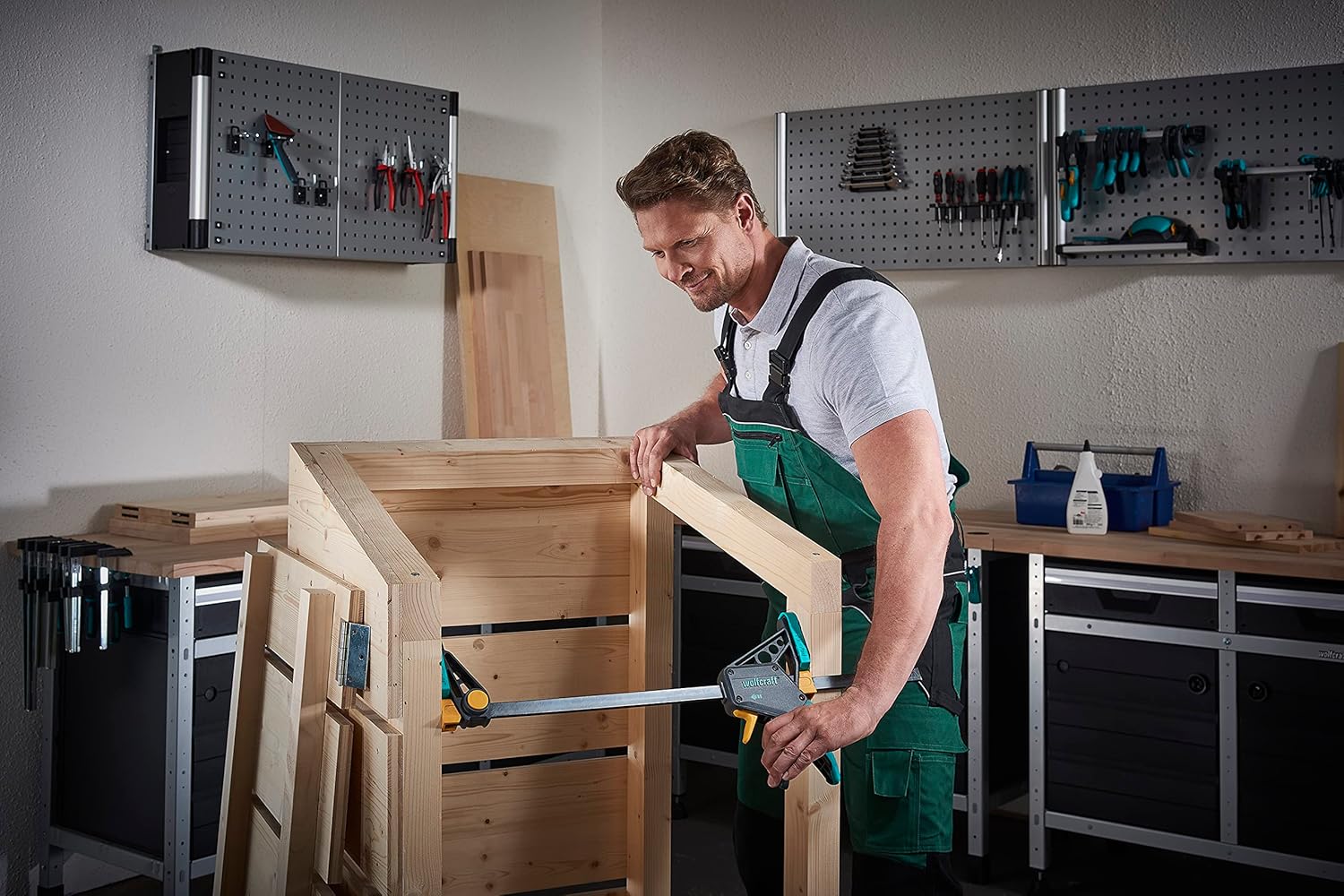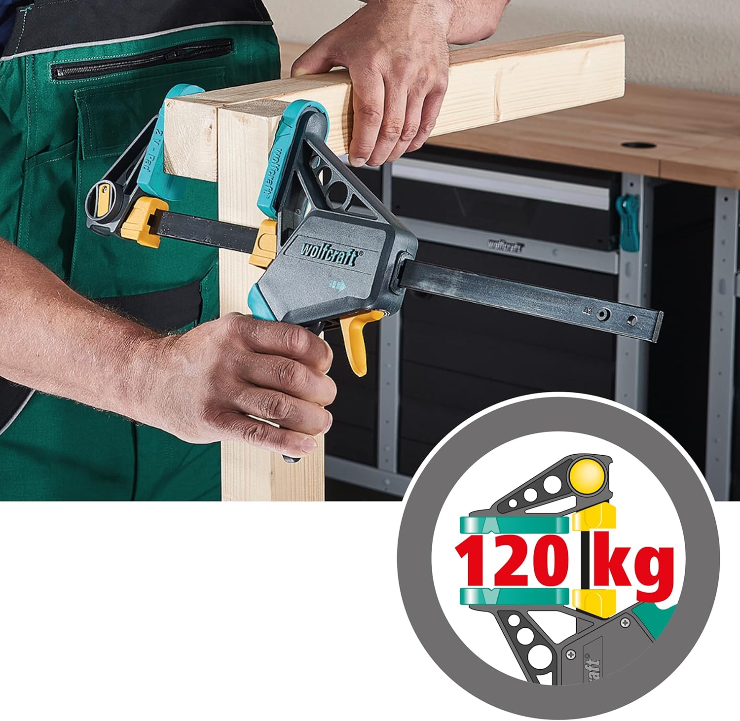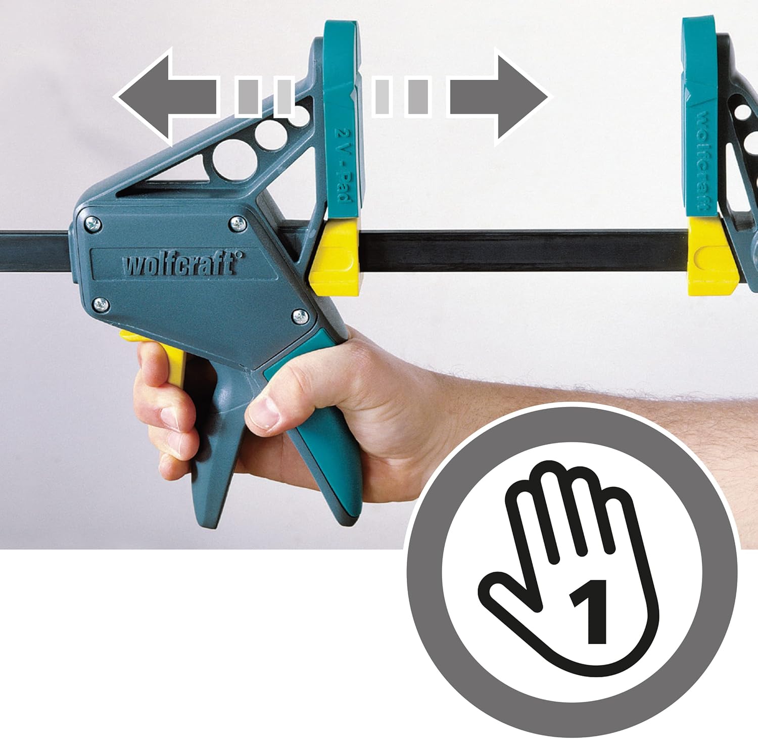 wolfcraft One-Hand Clamp PRO 100450 mm: The innovative One-Hand Clamp from wolfcraft is particularly powerful and suitable for solving all challenges related to clamping, expanding and fixing workpieces in a professional environment. The ergonomic handle and anti-slip zone make the clamp easy to operate and provides a secure grip when in use. The clamp is suitable for all workpieces, whether round or angular. A unique mechanism means you can clamp and release in a controlled manner, with just one hand a must-have for every DIY enthusiast! Product details: Part number: 3032000; Clamping force up to 120 kg; Depth: 100 mm; Clamping width: 450 mm; Expanding range: 210710 mm; Cross groove for safely clamping round objects; Effortless conversion to the spreading function by pushing a button; Quick, safe and convenient clamping with just one hand. Very easy release of the clamping pressure due to optimum leverage. High-quality rail that ensures high, long lasting clamping force. Adjustable spacers protect the workpiece and serve as support.wolfcraftAn award-winning, reputable and trusted German DIY brand. Since 1949 the wolfcraft brand has been synonymous with the development and production of high-quality tools and product innovations to meet the needs of DIY enthusiasts. Today, over 650 employees in 16 countries work on developing products that are not only innovative, but continuously improved upon, driving progress in the tools and accessories sector forwards.