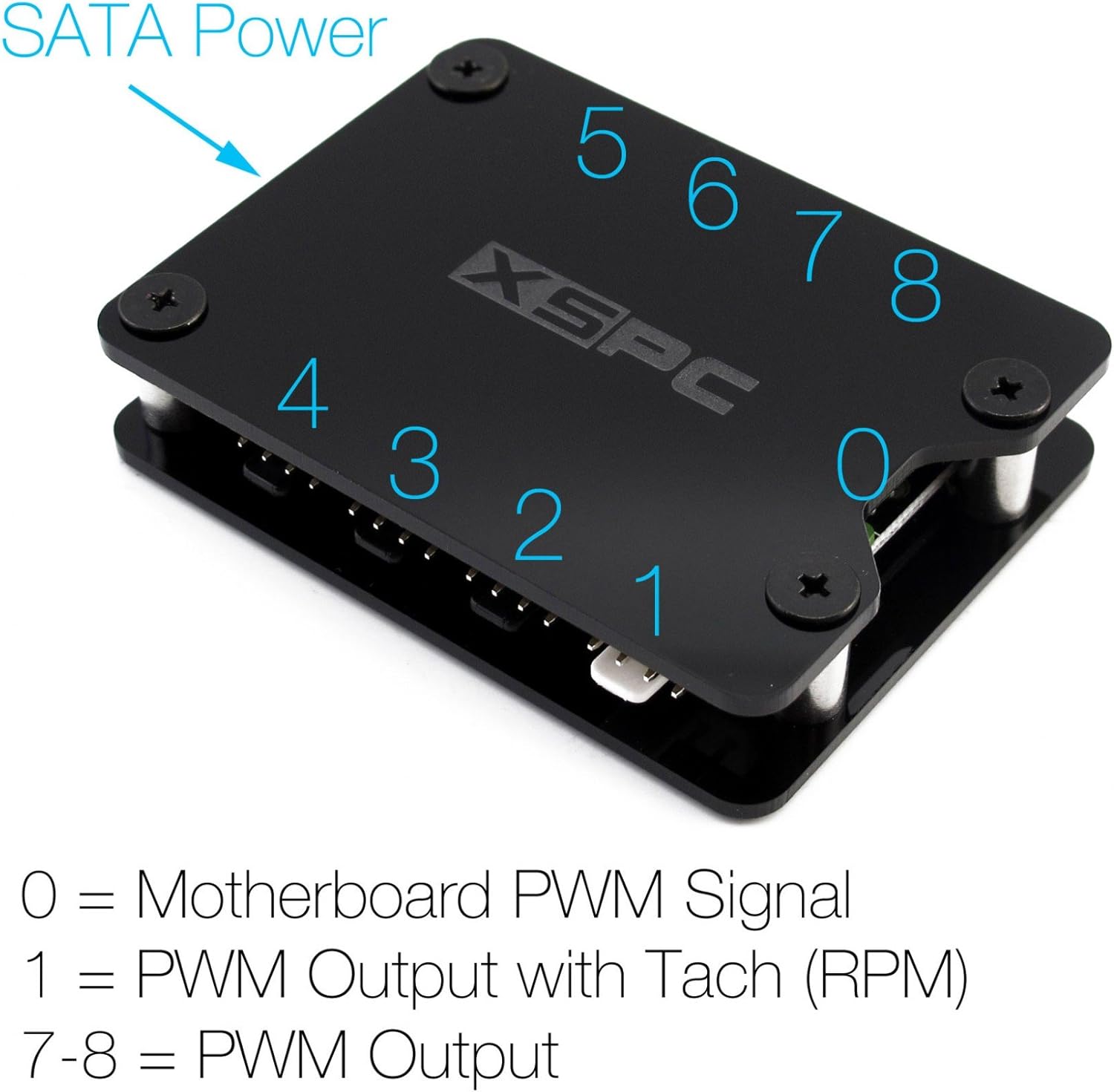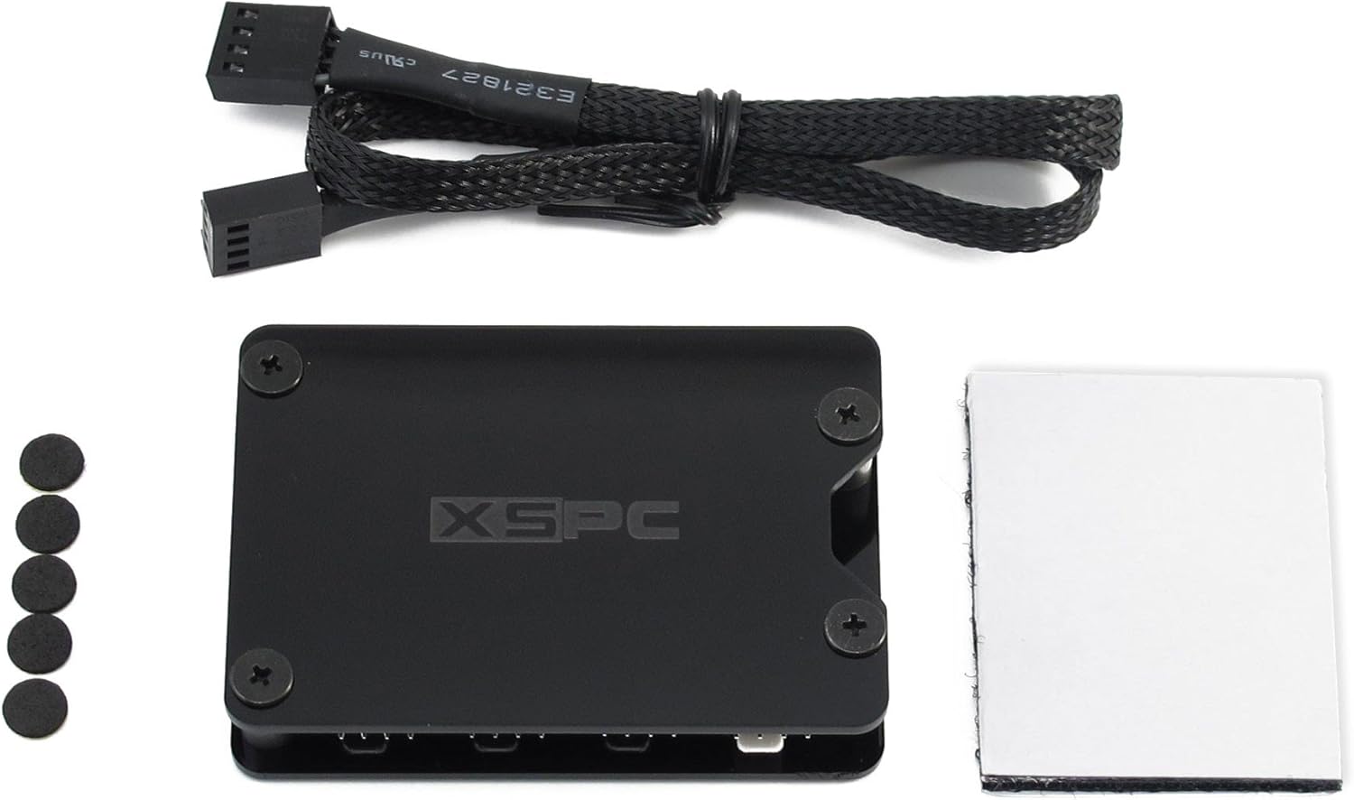 The XSPC PWM hub can power 8 fans simultaneously, while only taking up one PWM fan header on your motherboard. With a total output of 95W (~12W per channel), the hub can be expanded with Y splitter cables for additional fans (channels 2-8 only), taking the total supported fans to 15. At less than 15mm thick, the hub can be tucked away behind the motherboard tray, for neat cable management. The hub is supplied with an adhesive hook/loops pad, making it easy to mount it anywhere in your case. The hub can also be used with 3pin fans without PWM speed control, or run PWM fans at full speed by disconnecting the motherboard PWM input cable.