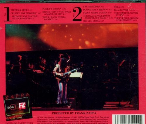When Zappa first released this album in ’78, Warner Brothers was especially nervous about a little tune called “Punky’s Whips.” The tune concerned drummer Terry Bozzio’s lurid sexual fantasies about one Punky Meadows, guitarist for the band Angel. Since Angel was then regarded as an important player in the music industry (yeah, right), Warners sat on the album for a long while and then deleted the track altogether. With this CD reissue “Punky’s Whips” is back in all its glory, along with four other songs not on the original vinyl.