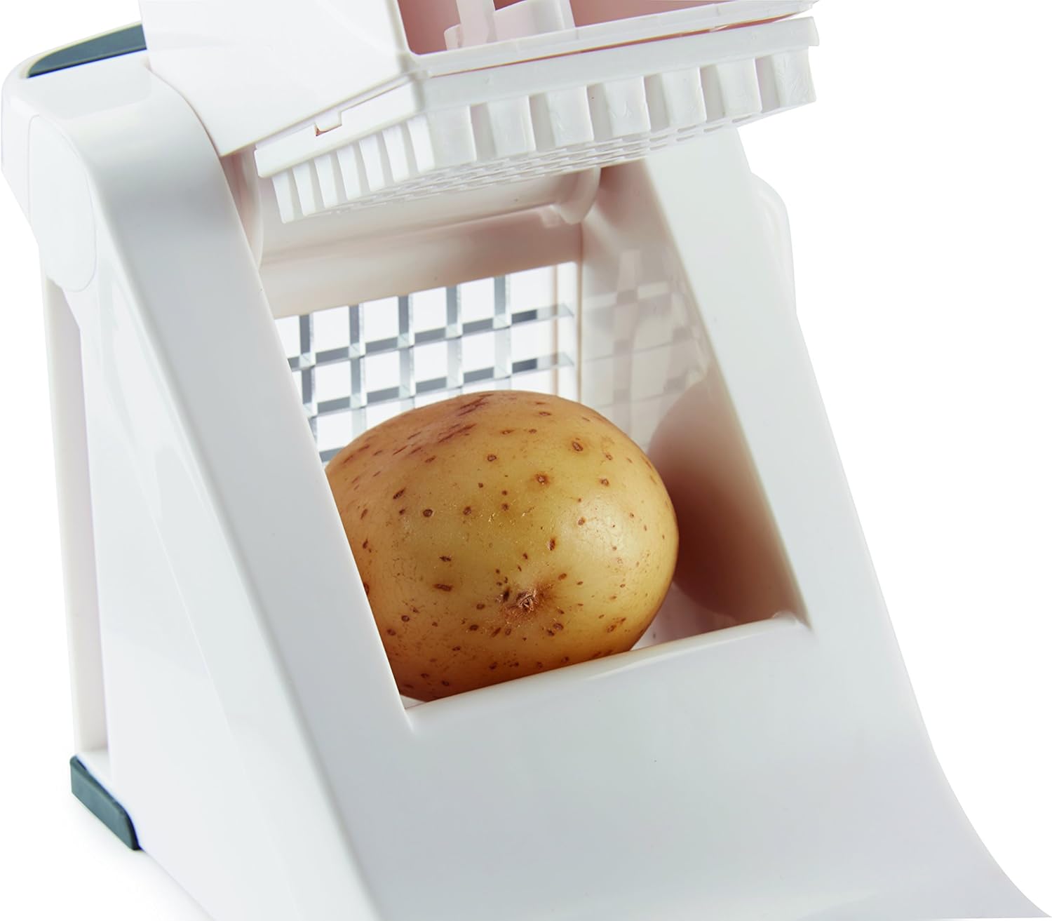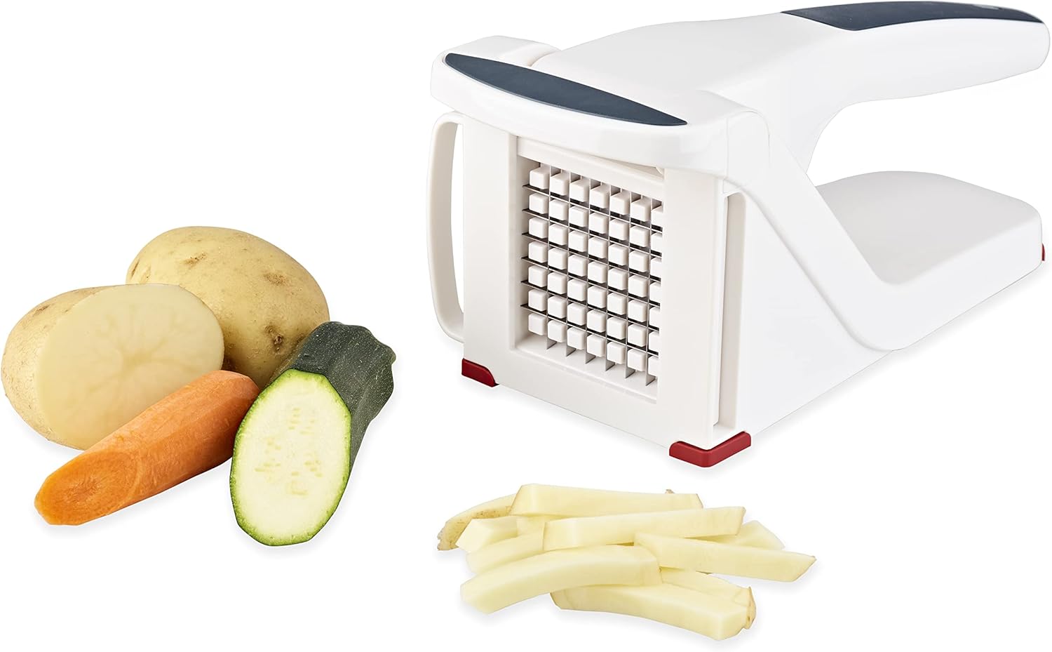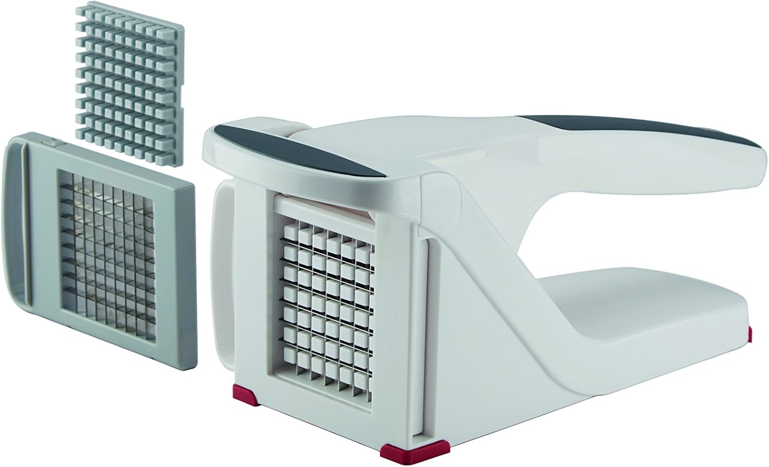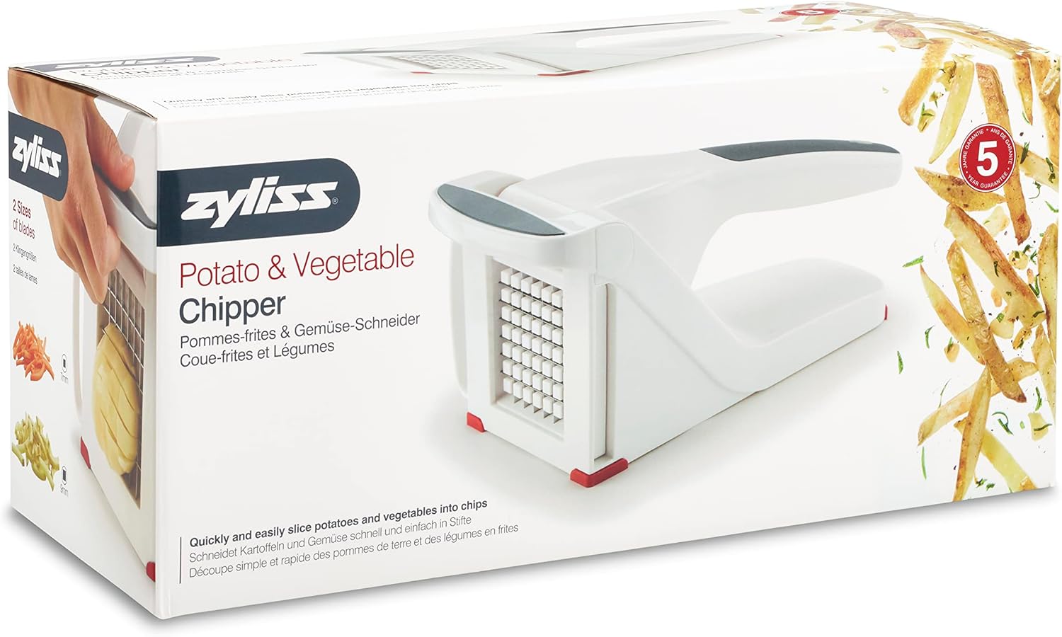 The Zyliss Potato & Vegetable Chipper comes with two changeable stainless steel blades – 7mm and 9mm.A large food chamber accommodates different shapes and sizes of potatoes and vegetables.Both the palm-resting lip and the soft touch handle feature non-slip grip surfaces for extra comfort and safety and the large base and extended handle aid effortless cutting.Non-slip rubber feet provide extra stability when in use.